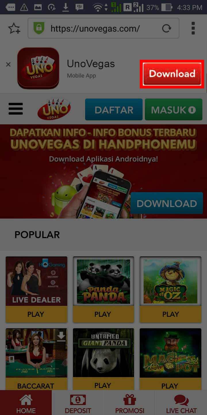 1. Masuk ke menu Browser Mobile anda dan Kunjungi www.unovegas.com setelah itu klik menu MOBILE lalu klik button Download Now , dan tunggu proses download selesai.