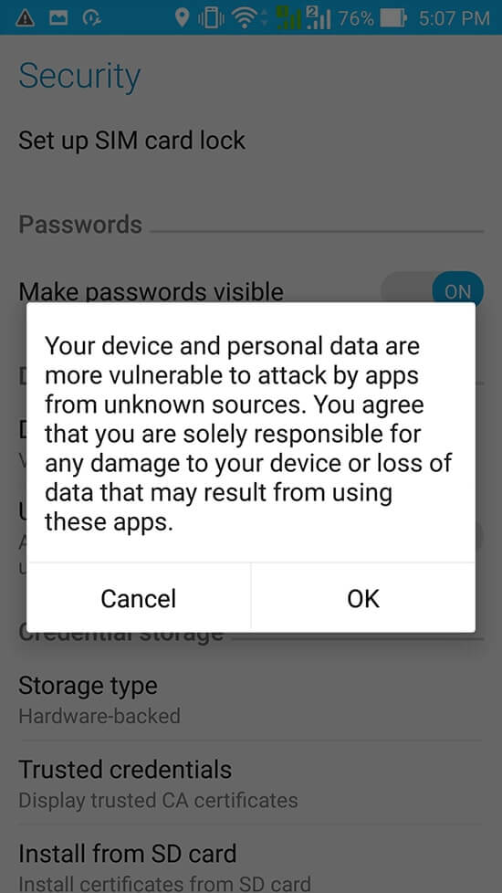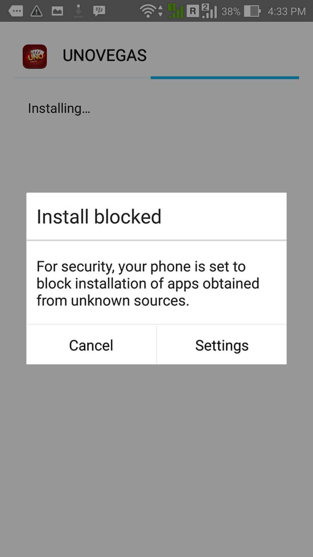2. Jika sudah selesai, klik dan install langsung file UNOVEGAS.apk, jika muncul keterangan Install Blocked, Pilih dan Klik “Settings”, setelah itu pilih “Unknown Source” di bagian “Security”, Centang/Klik pada bagian seperti yang dilingkari pada gambar dibawah ini.